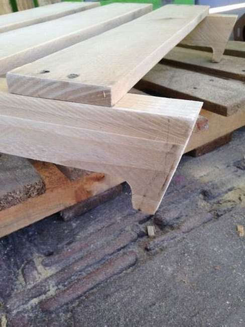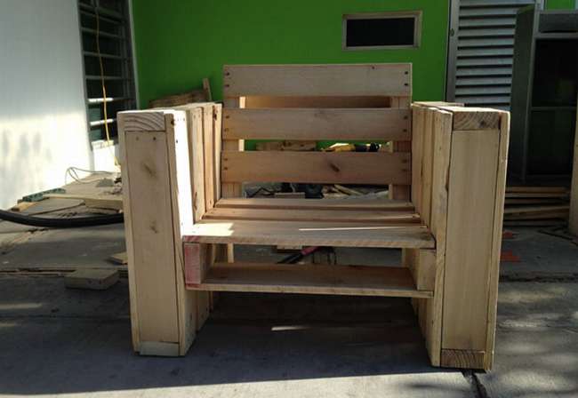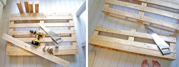 เลื่อยพาเลทให้เป็นสองส่วน โดยกำหนดสัดส่วนเองว่าจะให้ที่นั่งกว้างเท่าไร และพนักพิงแคบแค่ไหน