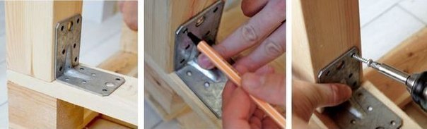 ยึดที่นั่งและพนักพิงเข้าหากันเป็นมุมฉาก โดยใช้มุมเหล็กและสกรู เจาะรูนำก่อนเพื่อให้ขันง่ายและไม้ไม่แตก