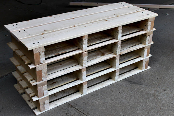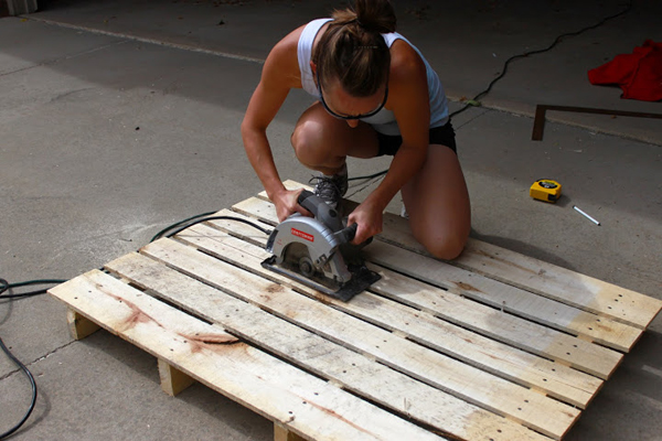 เลื่อยพาเลทหนึ่งชิ้นให้ได้สองส่วน โดยให้ด้านหนึ่งเหลือคาน 4 ท่อน อีกด้าน 5 ท่อน