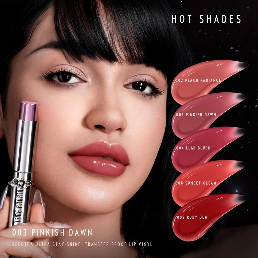 Time Phoria Spectra Ultra Stay-Shine Transfer Proof Lip Vinyl คือ ลิปสติกเนื้อไวนิลที่ออกแบบมาเพื่อให้ริมฝีปากดู ฉ่ำวาว สีชัด และติดทน ในเวลาเดียวกัน โดยจุดขายหลักของผลิตภัณฑ์นี้คือคำว่า