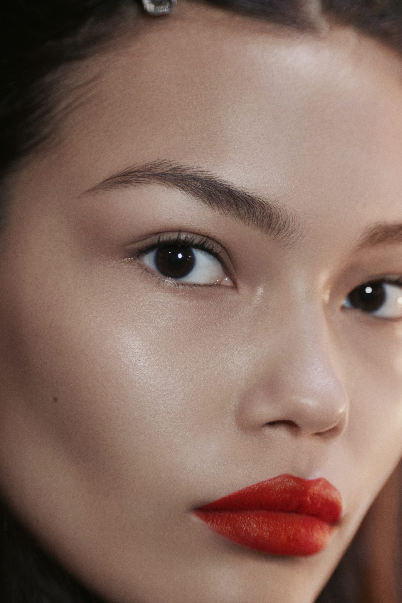 ผิวถูกคงความโกลว์แบบเป็นธรรมชาติ ให้ฟีลสดใส มีชีวิตชีวา ส่วนดวงตาถูกเพิ่มนิยามความคมด้วยการปัดมาสคาร่า LE VOLUME DE CHANEL NOIR แบบบางเบา เพื่อรักษาสมดุล ไม่ให้ดวงตาเด่นจนกลบริมฝีปาก