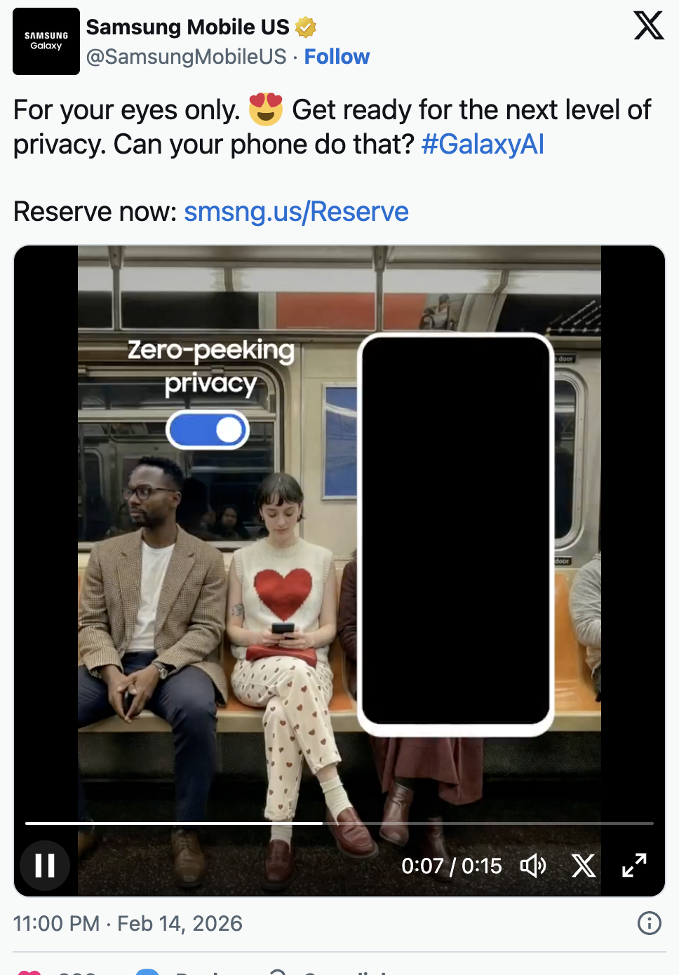 จากวิดีโอที่แชร์ผ่านบัญชี Samsung Mobile US บนแพลตฟอร์ม X (Twitter เดิม) จะเห็นหญิงคนหนึ่งนั่งอยู่บนรถไฟใต้ดิน กำลังอ่านเรื่องราวบางอย่างบนหน้าจอ Galaxy S26 Ultra