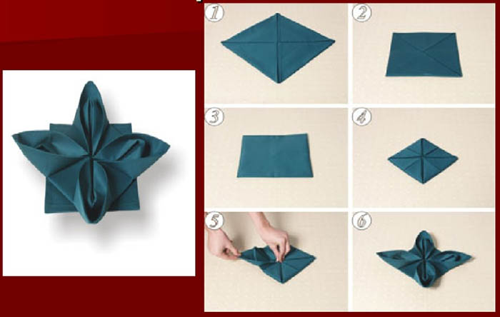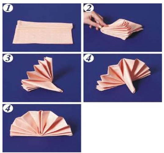 นำไปเสียบเรียงในที่ใส่ผ้าเช็ดปากให้เป็นครึ่งวงกลมเหมือนพัด