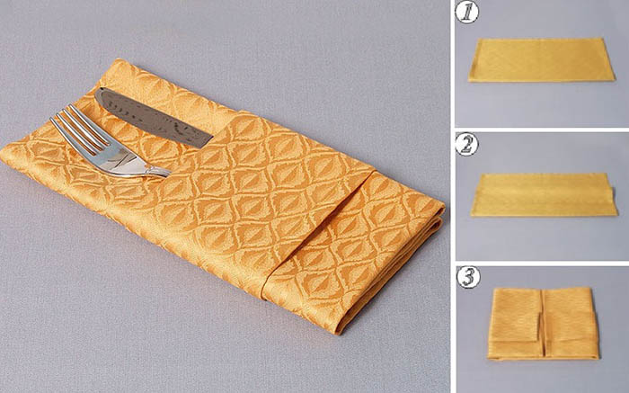เหมาะมากกับงานทางการ งานบริษัท หรือดินเนอร์ที่ต้องการความเรียบร้อย ช้อนส้อมของแขกแต่ละคนจะถูกจัดวางอย่างสวยงามในกระเป๋าเล็ก ๆ จากกระดาษเช็ดปาก