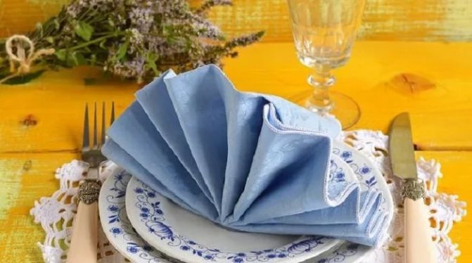ผ้าเช็ดปากหางนกยูงแบบนี้จะวางบนจานทีละชิ้น หรือจับรวมเป็นกลุ่มเล็ก ๆ ใกล้ช้อนส้อมก็ได้