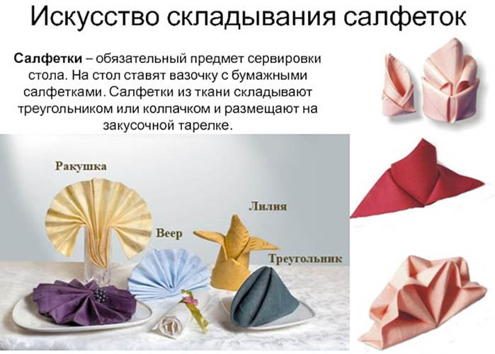 กระดาษเช็ดปากที่เราใช้กันทุกวัน ถูกจดสิทธิบัตรมาตั้งแต่ศตวรรษที่ 19 แต่เพิ่งจะฮิตใช้กันจริงจังบนโต๊ะอาหารราวยุค 1970 เป็นต้นมา จากเดิมที่วางเป็นแผ่นเรียบ ๆ เดี๋ยวนี้เราสามารถพับให้เป็นรูปร่างเก๋ ๆ เพิ่มบรรยากาศให้งานเลี้ยงได้แบบมืออาชีพ