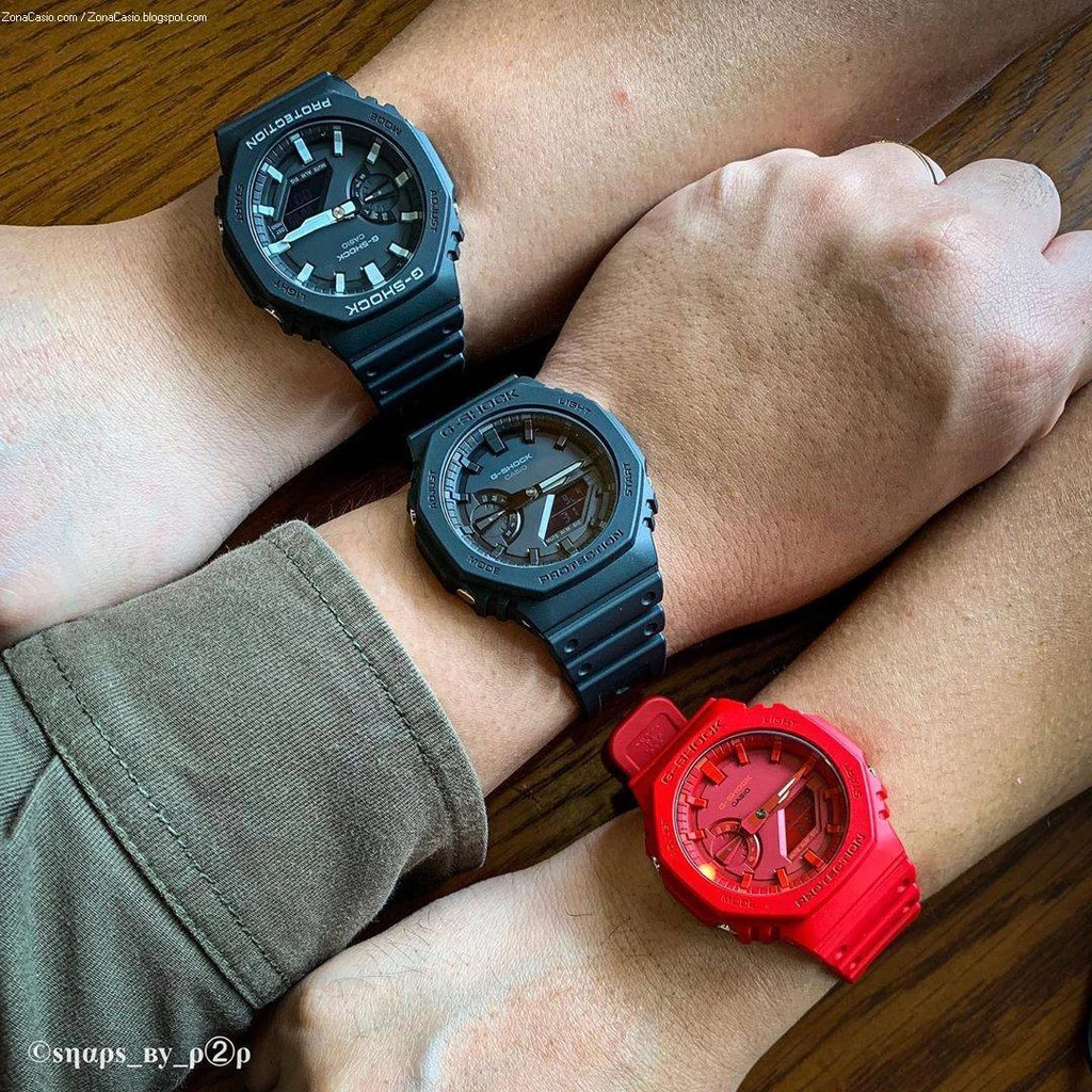GA-2100 / “Casioak” และ GA-2300: ดีไซน์กรอบ 8 เหลี่ยม ขนาดบางลง ใส่สบาย รุ่น GA-2300 ลดขนาดลงจาก GA-2100 เล็กน้อย ใช้สาย 24 มม. แบบสปริงบาร์มาตรฐาน ทำให้ถอดเปลี่ยนสายได้ง่ายขึ้น มาพร้อมโมดูล 5725 ที่มีฟังก์ชัน World Time, ปฏิทินเต็ม, จับเวลา 1/100 วินาที, ปลุก, สัญญาณรายชั่วโมง และฟังก์ชันขยับเข็มหลบหน้าจอย่อย กันน้ำ 200 เมตร ใช้แบตเตอรี่ อายุประมาณ 3 ปี