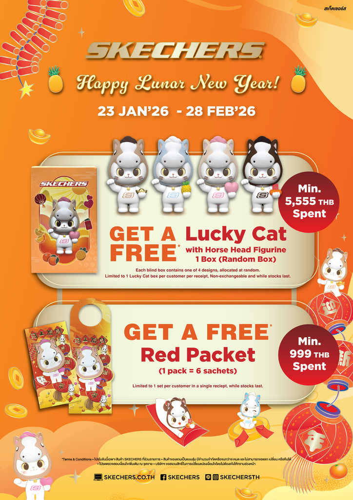 ตรุษจีนนี้ ถ้ากำลังเล็งรองเท้าคู่ใหม่อยู่แล้ว ลองแวะไปจัดที่ SKECHERS และอย่าลืมดูยอดให้ถึงขั้นรับของแถม เผื่อได้ Lucky Cat ไปตั้งรับทรัพย์ที่บ้านเพิ่มด้วยนะ