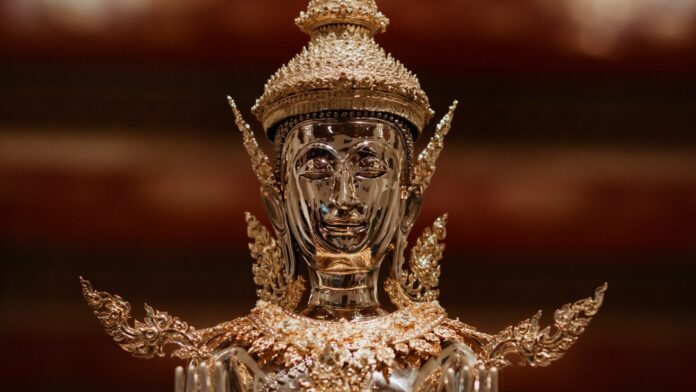 ในนิทรรศการยังมีผลงานจำลอง พระพุทธรูปทรงเครื่องต้น ซึ่งเป็นสัญลักษณ์ของพระมหาจักรพรรดิ สะท้อนแนวคิดเรื่องอำนาจและความศักดิ์สิทธิ์