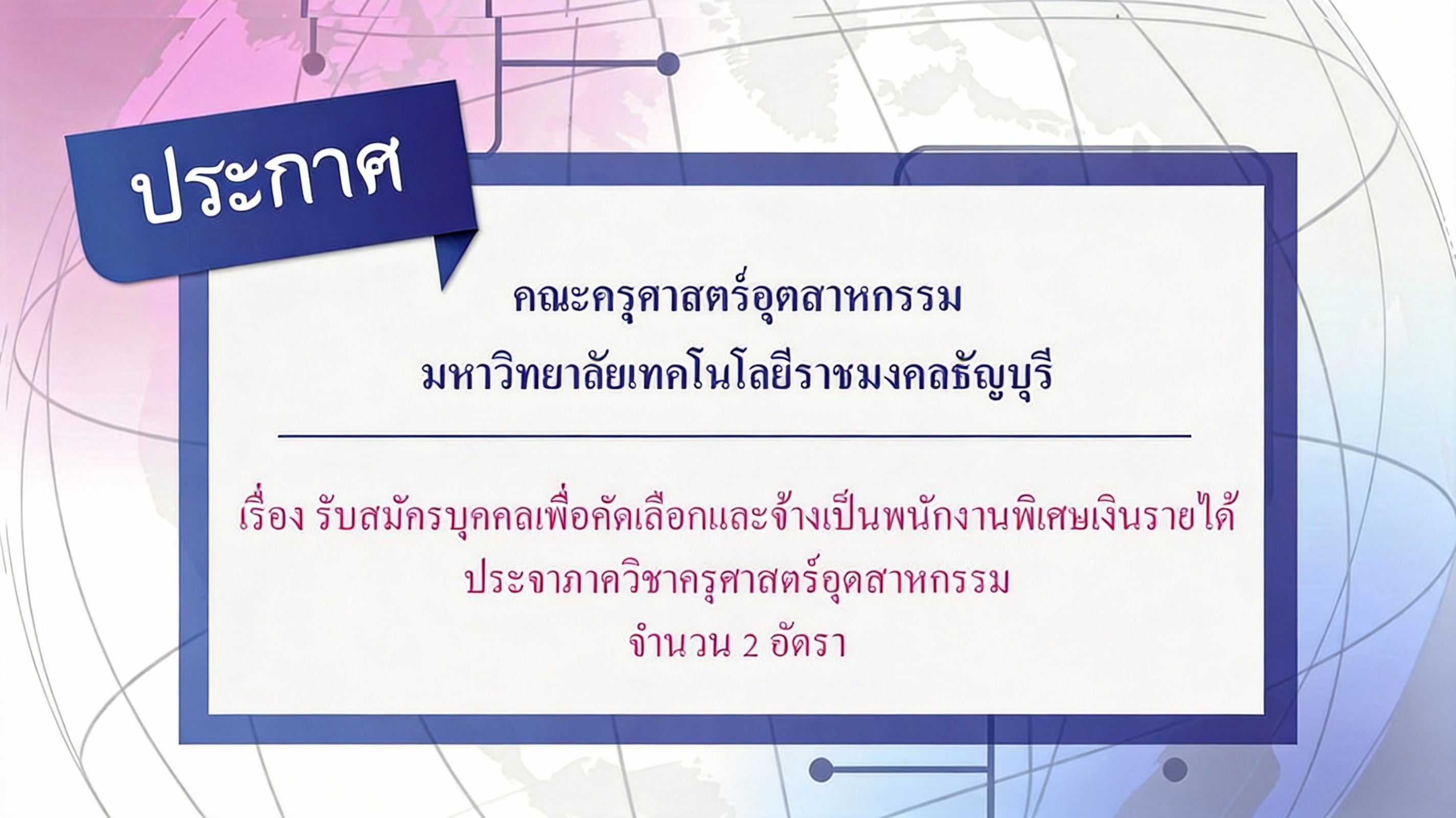 โดยสรุป คณะครุศาสตร์อุตสาหกรรมได้ประกาศรับสมัครบุคคลเพื่อคัดเลือกและจ้างเป็นพนักงานพิเศษเงินรายได้ประจำภาควิชาอย่างเป็นทางการแล้ว