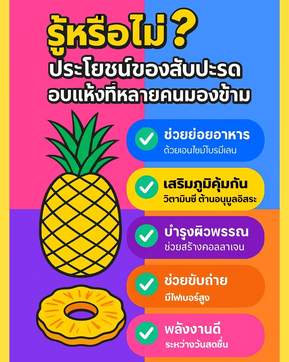 บทความนี้จะพาไปรู้จักสับปะรดอบแห้งแบบลึกกว่าเดิม ว่าดีต่อร่างกายอย่างไร เหมาะกับใคร และควรกินแบบไหนถึงจะคุ้มคุณค่าที่สุด