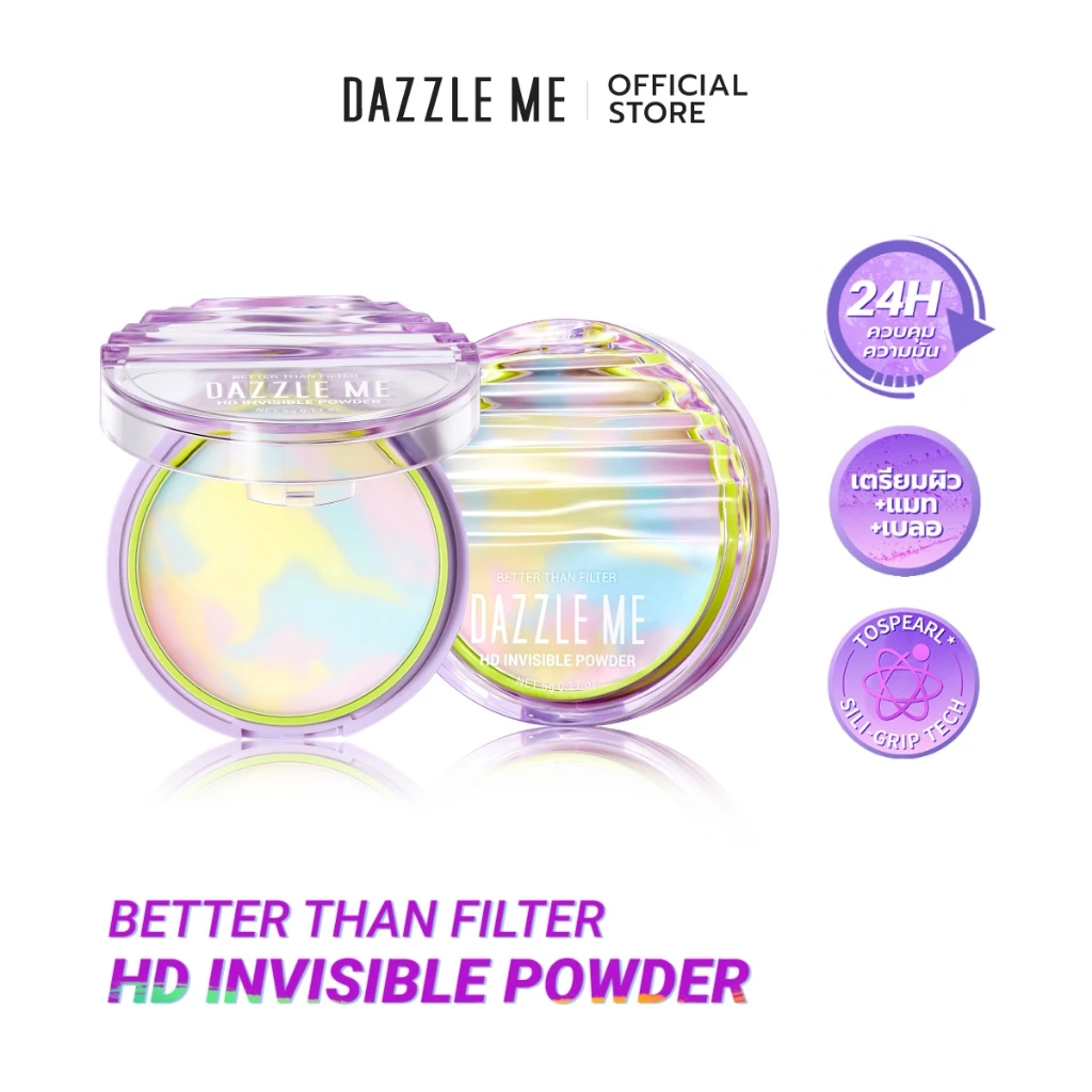 DAZZLE ME Better Than Filter HD Invisible Powder ไม่ใช่เพียงแค่แป้งฝุ่นธรรมดา แต่เป็นไอเท็มที่ช่วยยกระดับผิวให้ดูเรียบเนียนแบบ HD ควบคุมความมันยาวนาน 24 ชั่วโมง พร้อมนวัตกรรมไร้ฝุ่นที่ตอบโจทย์ไลฟ์สไตล์ยุคใหม่
