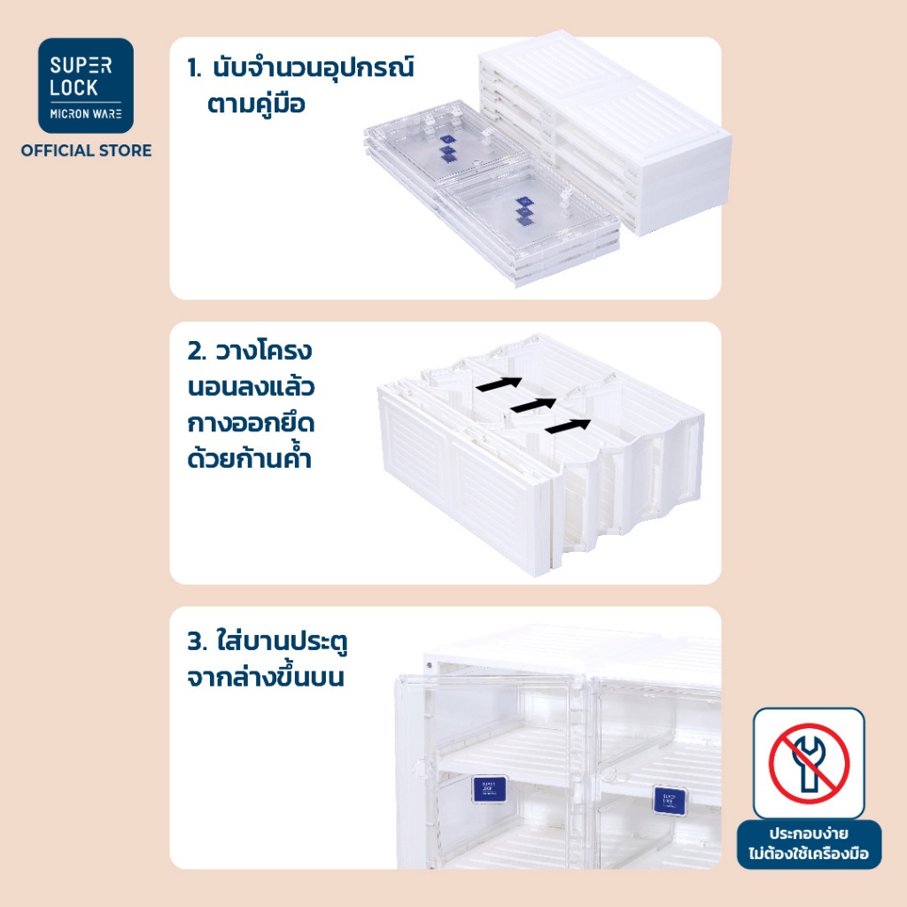 การกางและพับตู้รองเท้า Super Lock ทำได้ง่าย ไม่ต้องใช้เครื่องมือพิเศษ โครงสร้างถูกออกแบบให้ประกอบและใช้งานได้สะดวก เหมาะกับทุกคนในบ้าน