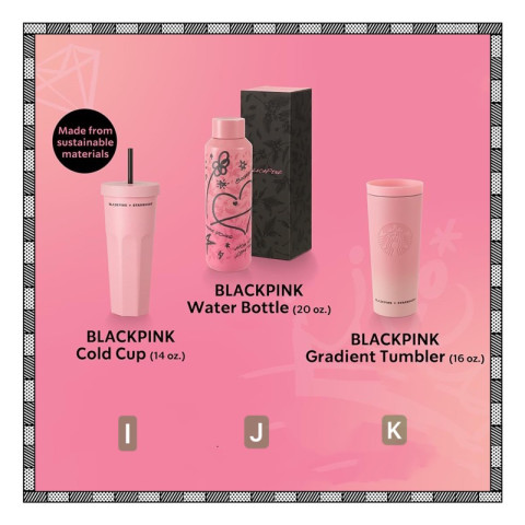 แก้วเย็นขนาดกะทัดรัด พกง่าย ไม่ใหญ่จนเกินไป ดีไซน์เรียบแต่มีลูกเล่นสไตล์ BLACKPINK เหมาะสำหรับใช้ทุกวันJ. BLACKPINK Water Bottle (20 oz) – 1,850 บาท