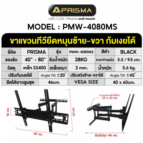 PRISMA ขาแขวนทีวี รุ่น PMW-4080MS รองรับการใช้งานร่วมกับทีวี ขนาดจอ 40-80 นิ้ว รองรับน้ำหนักสูงสุด 55 กิโลกรัม
