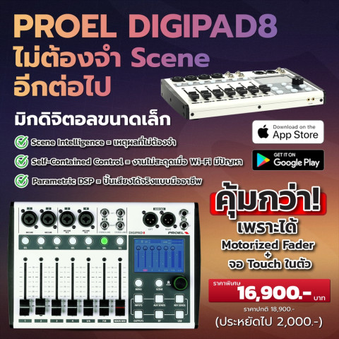 หากคุณกำลังมองหา ดิจิตอลมิกเซอร์ที่พกง่าย คุมง่าย แต่คุณภาพระดับโปร พร้อม Bluetooth และ USB Audio ในตัว Proel DIGIPAD8 คือคำตอบที่พร้อมไปกับคุณทุกงาน ทุกเวที ในราคาที่คุ้มค่าเมื่อเทียบกับความสามารถที่ได้รับ