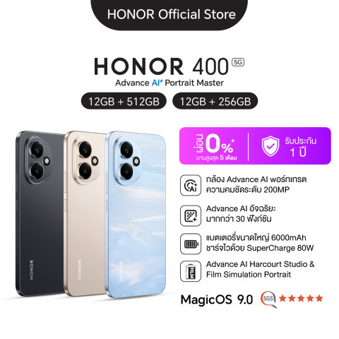 สัมผัสประสบการณ์สมาร์ทโฟนยุคใหม่กับ HONOR 400 5G ที่ผสานดีไซน์พรีเมียม ประสิทธิภาพแรง และกล้อง AI ความละเอียดสูงแบบจัดเต็ม มาพร้อมหน่วยความจำจุใจ 12GB + 512GB แบตเตอรี่สุดอึด 6000mAh และรองรับเครือข่าย 5G ให้คุณใช้งานได้ลื่นไหลทั้งวันในเครื่องเดียว