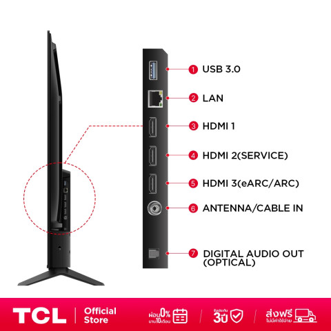 ด้านการเชื่อมต่อ TCL 55T6C รองรับอินพุตและการเชื่อมต่อที่ครบครัน เหมาะสำหรับทั้งการใช้งานด้านความบันเทิงและการทำงาน คุณสามารถเชื่อมต่อเครื่องเล่นเกมคอนโซล รุ่นใหม่, Soundbar, ชุดโฮมเธียเตอร์, HDD, Flash Drive, คอมพิวเตอร์ หรือแม้แต่เชื่อมต่อไร้สายกับสมาร์ตโฟนและหูฟัง Bluetooth ได้อย่างสะดวกผ่าน Bluetooth 5.2 และ Wi-Fi 5
