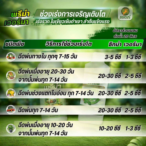 พืชผัก: ฉีดพ่นทางใบทุกๆ 7–15 วัน อัตรา 3–5 ซีซี