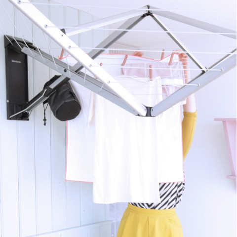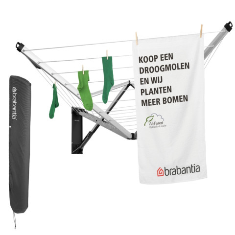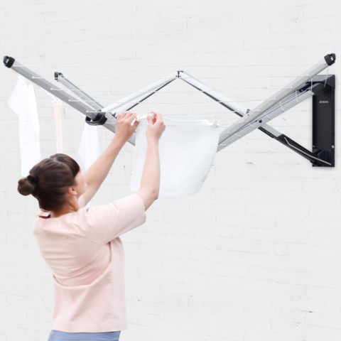 Brabantia ราวตากผ้าติดผนังพับเก็บได้ รุ่น WallFix Dryer 24m พร้อมผ้าคลุม คือโซลูชันการตากผ้าแบบติดผนังที่ช่วยประหยัดพื้นที่ได้อย่างลงตัว เหมาะสำหรับบ้าน คอนโด หรือระเบียงที่มีพื้นที่จำกัด แต่ต้องการราวตากผ้าที่รองรับผ้าได้มากและใช้งานสะดวก เมื่อไม่ใช้งานสามารถพับเก็บแนบผนังได้เรียบเนียน ไม่เกะกะสายตา และเมื่อกางออกสามารถรองรับผ้าได้มากถึงประมาณ 2.5 รอบการซักจากเครื่องซักผ้า ช่วยให้การตากผ้าของคุณเป็นระเบียบและมีประสิทธิภาพมากขึ้น