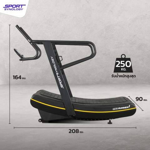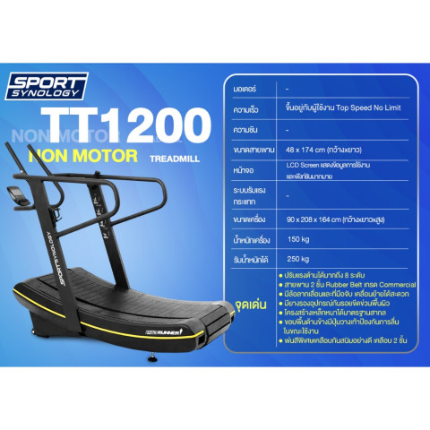 SPORT SYNOLOGY Non motor รุ่น TT1200 Curved Treadmill ลู่วิ่งไร้มอเตอร์เกรด Commercial ที่ออกแบบมาเพื่อยกระดับการวิ่งของคุณอย่างแท้จริง ด้วยดีไซน์สายพานโค้ง (Curved Design) ใช้พลังจากผู้วิ่ง 100% ไม่ต้องใช้ไฟฟ้า ให้ความรู้สึกการวิ่งที่เป็นธรรมชาติ เผาผลาญแคลอรี่ได้มากกว่าลู่วิ่งทั่วไปถึง 60% เหมาะทั้งสำหรับผู้เริ่มต้น นักวิ่งจริงจัง ไปจนถึงยิมและฟิตเนสที่ต้องการอุปกรณ์มาตรฐานสูง รองรับการใช้งานหนักต่อเนื่องอย่างมั่นใจ