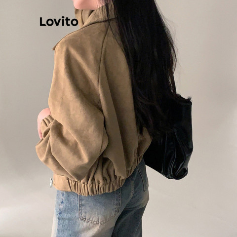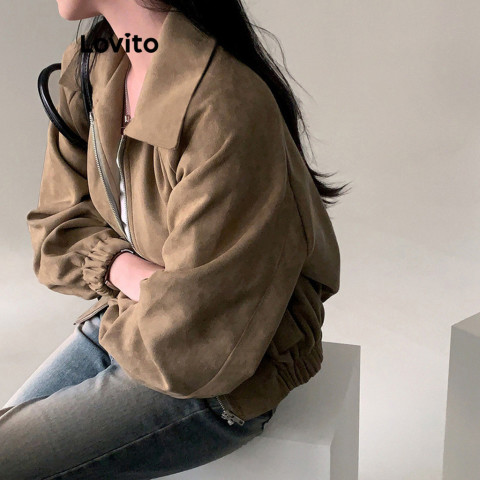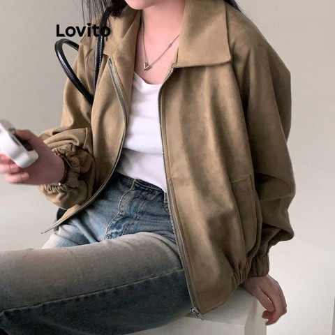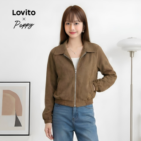 Lovito x Poppy เสื้อแจ็คเก็ตซิปลำลองสีพื้น ฤดูใบไม้ร่วง/ฤดูหนาว สำหรับผู้หญิง รุ่น Lne30129 (สีน้ำตาล)