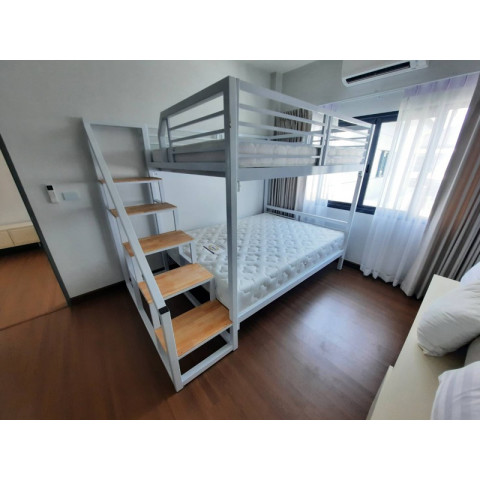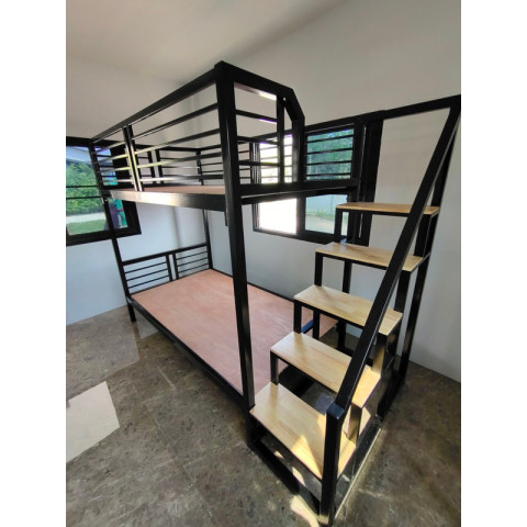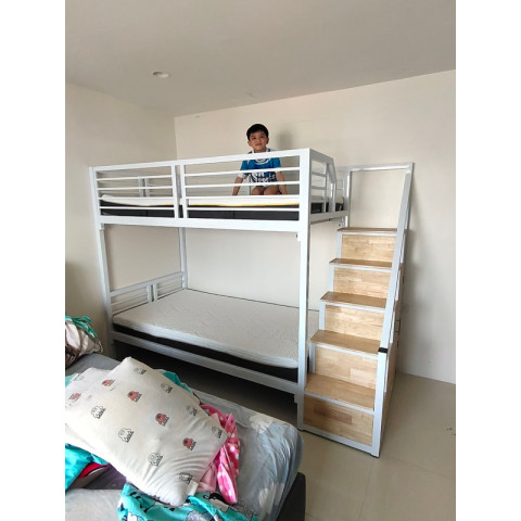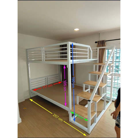 โครงสร้างเป็น เตียงเหล็กกล่อง 2 ชั้น เคลือบสีอบความร้อนสูง ช่วย กันสนิม และเพิ่มความทนทาน รองรับน้ำหนักผู้ใหญ่ได้สบาย พร้อม บันไดเดินขึ้นลงง่าย เด็กๆ สามารถขึ้นลงเองได้อย่างมั่นใจ และยังสามารถ เลือกตำแหน่งบันไดซ้าย/ขวา ให้เหมาะกับพื้นที่ห้องได้