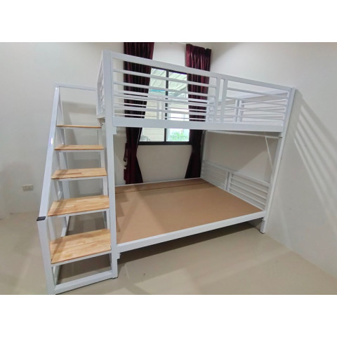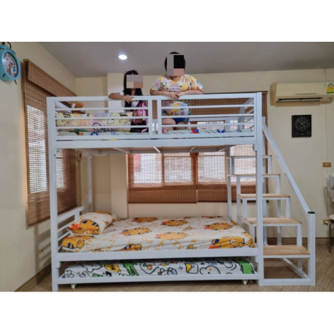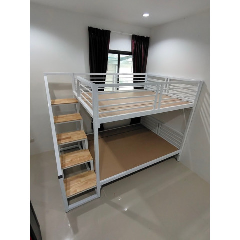 เตียงเหล็ก 2 ชั้น บันไดเดิน สีขาว/สีดำ แข็งแรง เหล็กหนาพิเศษ พร้อมไม้รองนอน จัดส่งฟรี (ตามพื้นที่ที่กำหนด) ในราคา 16,900.00 บาท (ราคาเฉพาะเตียง ไม่รวมที่นอน) เหมาะทั้งห้องนอนบ้านพัก ห้องเด็ก ห้องพนักงาน หอพัก หรือบ้านที่ต้องการประหยัดพื้นที่ แต่ยังต้องการเตียงที่มั่นคง ไม่โยกเยก และใช้งานได้จริงทุกวัน