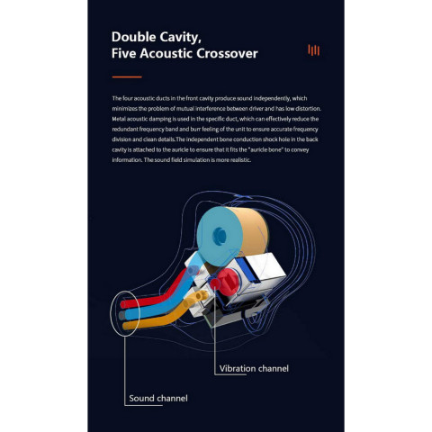 ย่านซับเบสและบรรยากาศเสียง ใช้ไดรเวอร์ bone conduction จาก Sonion ควบคุมบรรยากาศความถี่กลาง-ต่ำ ถ่ายทอดมวลและแรงสะเทือนผ่านโครงสร้างกระดูก เพิ่มความรู้สึกโอบล้อมของเวทีเสียง