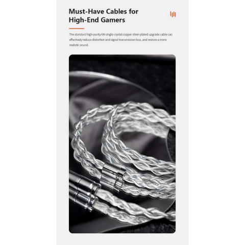 สายอัพเกรดที่ให้มาพร้อมหูฟังเป็นสาย ทองแดงผลึกเดี่ยวชุบเงิน 6N OCC ที่ใช้เทคนิค Ohno Continuous Casting เพื่อลดปริมาณออกซิเจนในเนื้อสายให้น้อยที่สุด สายมีความบริสุทธิ์สูง ช่วยลดการบิดเบือนและการสูญเสียสัญญาณ ส่งผ่านรายละเอียดเสียงได้สมจริงขึ้นทั้งย่านต่ำและย่านสูง ด้วยการชุบเงินบริเวณผิวตัวนำ ทำให้เสียงย่านสูงมีความเคลียร์ใส เปิดโปร่ง ย่านต่ำยังคงอิ่มแน่นและมีมวล