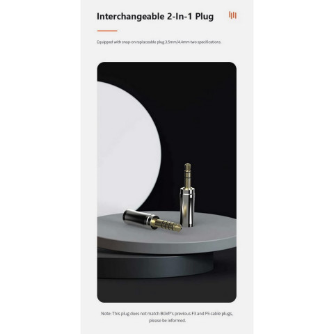 นอกจากนี้ยังมาพร้อม แจ็คแบบถอดเปลี่ยนได้ 2-in-1 ขนาด 3.5 mm / 4.4 mm ครอบคลุมทั้งการใช้งานกับสมาร์ทโฟน แอมป์พกพา และเครื่องเล่นเพลงระดับไฮเอนด์ได้อย่างสะดวกในชุดเดียว โดยไม่ต้องซื้อสายเพิ่มให้ยุ่งยาก (หมายเหตุ: ปลั๊กนี้ไม่รองรับกับสายเคเบิลรุ่น F3 และ F5 เดิมของ BGVP)
