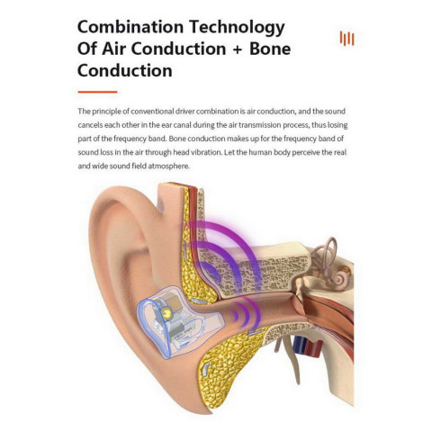 เทคโนโลยี Air Conduction + Bone Conduction ถูกนำมารวมเข้าด้วยกันเพื่อชดเชยความถี่เสียงที่สูญเสียไปขณะเดินทางผ่านอากาศ โดยใช้การสั่นสะเทือนผ่านกระโหลกศีรษะให้ร่างกายรับรู้สนามเสียงที่แท้จริงได้ครบถ้วนมากขึ้น ให้เวทีเสียงกว้าง มีมิติ ทั้งด้านซ้าย-ขวา และด้านลึก ถ่ายทอดบรรยากาศการแสดงสดได้อย่างสมจริง