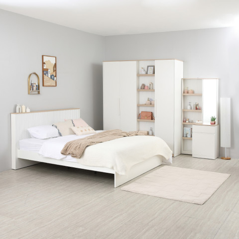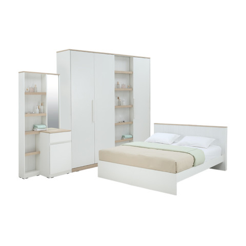 หนึ่งชุดครบชุด ประกอบด้วยเตียงนอนขนาด 5 ฟุต ตู้เสื้อผ้า 4 บาน และโต๊ะเครื่องแป้ง ฟังก์ชันครบ ใช้งานสะดวก ลงตัวทั้งเรื่องดีไซน์และการจัดเก็บ ช่วยเปลี่ยนห้องว่างให้กลายเป็นห้องนอนสวยพร้อมใช้งานได้ทันที