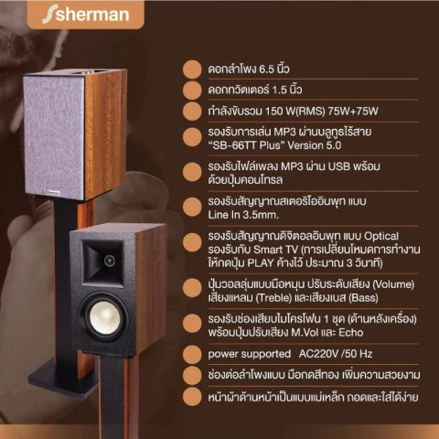 อัพเกรดประสบการณ์ความบันเทิงในบ้านของคุณด้วย SHERMAN SB-66TT+ Plus ลำโพงบลูทูธ 2.0 Ch ขนาด 6.5 นิ้ว กำลังขับรวม 150W ลำโพงตั้งพื้นแบบ Bookshelf พร้อมขาตั้ง ที่ให้ทั้งดีไซน์พรีเมียมและพลังเสียงเกินราคา เหมาะทั้งสำหรับดูหนัง ฟังเพลง เล่นเกม และใช้เป็นลำโพงมอนิเตอร์ทำเพลงในสตูดิโอขนาดเล็ก