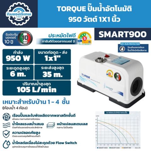 เพิ่มแรงดันน้ำทั้งบ้านให้ไหลแรง ลื่นไหล ไม่มีสะดุด ด้วย TORQUE ปั๊มอัตโนมัติ 950 วัตต์ 1x1 นิ้ว รุ่น SMART900 ปั๊มน้ำอัตโนมัติประสิทธิภาพสูง เหมาะสำหรับบ้านพักอาศัย 1 - 4 ชั้น (รองรับได้ถึง 4 ห้องน้ำ) ตอบโจทย์ทั้งการใช้งานในบ้าน และอาคารเชิงพาณิชย์ ที่ต้องการแรงดันน้ำสม่ำเสมอ ใช้น้ำหลายจุดพร้อมกันได้สบาย