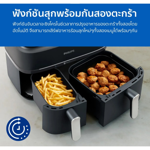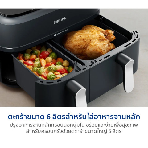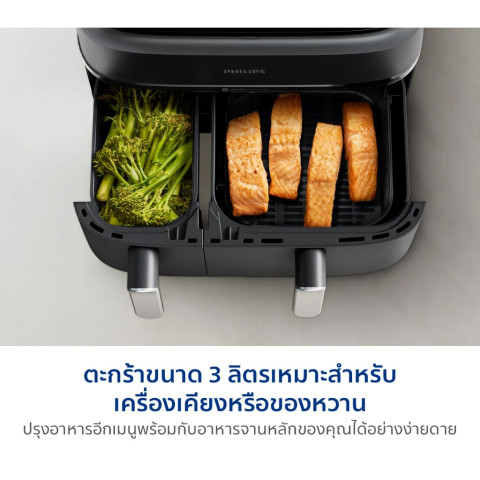 ทำ 2 เมนูพร้อมกันด้วย Dual Basket ลิ้นชักใหญ่เหมาะกับอาหารจานหลัก/มันฝรั่งทอด ส่วนลิ้นชักเล็กเหมาะกับผัก เครื่องเคียง และขนมขบเคี้ยว