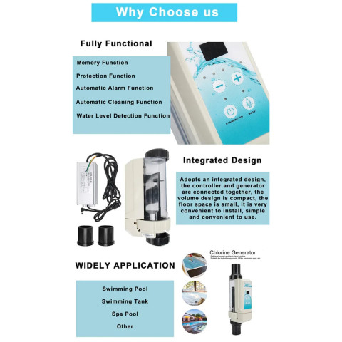 เพียงเติมเกลือลงในสระให้ได้ระดับที่เหมาะสม เครื่องจะเปลี่ยนเกลือให้กลายเป็นคลอรีนอย่างอัตโนมัติ ช่วยยับยั้งแบคทีเรีย สาหร่าย และเชื้อโรคต่าง ๆ ทำให้น้ำในสระสะอาดใส พร้อมใช้งานอยู่เสมอ เหมาะสำหรับสระว่ายน้ำส่วนตัว สระสปา แท็งค์ว่ายน้ำ และสระอินฟินิตี้