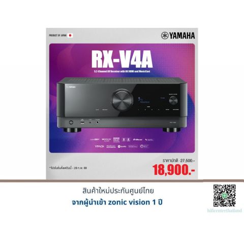 YAMAHA RX-V4A เครื่องเสียง AV Receiver 5.2ch 80W ยกระดับความบันเทิงในบ้านให้ “เหมือนโรงภาพยนตร์” ด้วยพลังเสียงรอบทิศทางที่หนักแน่น รองรับทั้งหนัง เกม และเพลงแบบครบเครื่อง มาพร้อมระบบปรับจูนห้องอัตโนมัติ YPAO และการสตรีมไร้สายผ่าน MusicCast ให้คุณคุมทุกอย่างได้ง่ายผ่านแอปและเสียงสั่งงาน