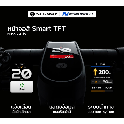ตัวรถติดตั้งหน้าจอสี Smart TFT ขนาด 2.4 นิ้ว แสดงข้อมูลสำคัญ เช่น ความเร็ว ระยะทาง ระดับแบตเตอรี่ โหมดการขับขี่ รวมถึงฟังก์ชันนำทาง และการแจ้งเตือนชื่อสายเรียกเข้า ช่วยให้คุณไม่พลาดทุกการติดต่อ แม้ระหว่างเดินทาง