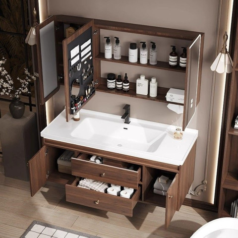 ยกระดับบรรยากาศห้องน้ำให้ดูหรูคลาสสิกด้วย ชุดตู้ล้างหน้าอ่างเซรามิคไม้วอลนัทสไตล์จีนโบราณ ที่ผสานความงามแบบดั้งเดิมเข้ากับการใช้งานจริงอย่างลงตัว โทนไม้สีวอลนัทให้ความอบอุ่น สุขุม และดูมีราคา เหมาะกับบ้านสไตล์คลาสสิก จีนวินเทจ หรือผู้ที่ชอบงานดีไซน์ที่มีเอกลักษณ์