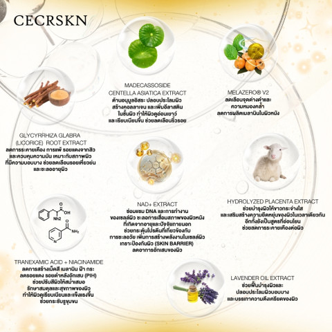Madecassoside (ใบบัวบก) ปลอบประโลม ลดการอักเสบ ลดรอยแดง และช่วยให้ผิวแข็งแรงขึ้น
