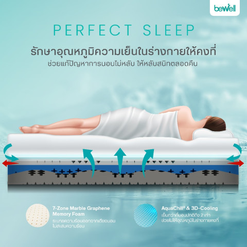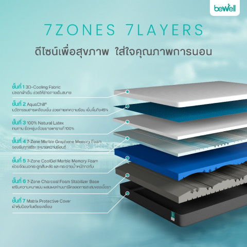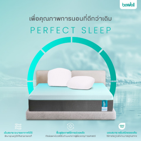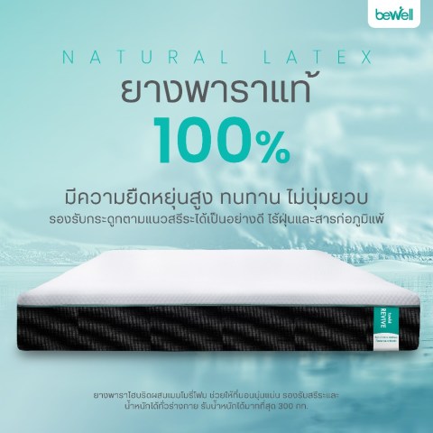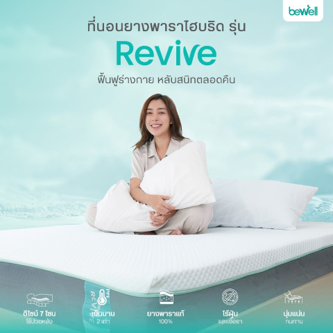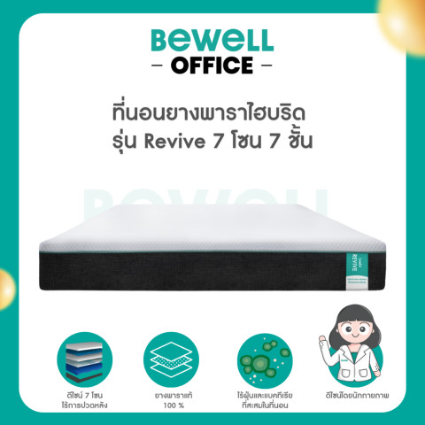 Bewell ที่นอนยางพาราไฮบริด รุ่น Revive 7 โซน 7 ชั้น ที่นอนเพื่อสุขภาพที่ออกแบบเฉพาะโดยทีมนักกายภาพบำบัดบีเวล ช่วยจัดแนวสรีระให้ถูกต้อง ลดแรงกดทับแบบเป็นโซน นอน “นุ่มแน่นกำลังดี” ตื่นมาไม่ปวดหลัง พร้อมสัมผัสเย็นสบายด้วยผ้าหุ้มเส้นใย Cooling และนวัตกรรม AquaChill® ที่ช่วยระบายความร้อน ให้เย็นสบายมากกว่าที่นอนทั่วไปได้ถึง 45% เพื่อการนอนที่มีประสิทธิภาพตามหลัก Perfect Sleep