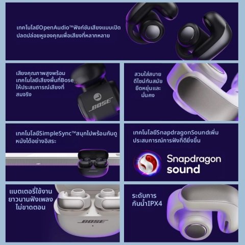 หมายเหตุ: ข้อมูลเชิงลึกบางรายการ (เช่น เวลาการใช้งานแบตเตอรี่ มาตรฐานกันน้ำ โค้ดรุ่น และอุปกรณ์ในกล่อง) อาจแตกต่างตามรุ่นย่อยของสินค้า Bose โปรดตรวจสอบรุ่นที่เลือกก่อนสั่งซื้อเพื่อความถูกต้อง