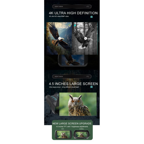 กล้องส่องทางไกลดิจิตอล 4.5 นิ้ว TFT พร้อมระบบอินฟราเรด ตัวช่วยคู่ใจสำหรับสายแคมป์ปิ้ง เดินป่า เฝ้าระวัง หรือสังเกตสัตว์ป่ายามค่ำคืน ให้ภาพคมชัดทั้งกลางวันและกลางคืน ด้วยเลนส์รูรับแสงกว้าง F1.2 ผสานไฟอินฟราเรดกำลังแรง 3W ปรับได้หลายระดับ มองเห็นในที่มืดสนิทได้ไกลประมาณ 350–400 เมตร พร้อมหน้าจอ TFT ขนาดใหญ่ 4.5 นิ้ว ดูภาพได้ชัดเต็มตาและปรับความสว่างได้ถึง 7 ระดับ