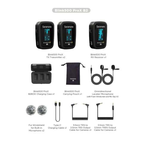 Saramonic Blink500 ProX B2 Wireless Microphone (รับประกัน 1ปี) ไมค์ไวเลสคุณภาพสูงสำหรับสายถ่ายคอนเทนต์ วล็อก ไลฟ์สด สัมภาษณ์ และงานวิดีโอที่ต้องการเสียงคมชัดแบบมืออาชีพ มาเป็นชุด B2 (ตัวส่ง 2 ตัว + ตัวรับ 1 ตัว) พร้อม จอ OLED ที่แสดงสถานะชัดเจน ใช้งานง่าย อัดเสียงได้ละเอียดสูงสุด 24bit/48kHz และรับเสียงรอบทิศทาง เหมาะกับทั้งกล้องและมือถือ