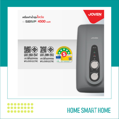 เครื่องทำน้ำอุ่น Joven รุ่น SB11iP 4,500 วัตต์ (ปั๊มน้ำในตัว) สีเทาเข้ม ทางเลือกสำหรับบ้านที่เจอปัญหาน้ำไหลเบา ด้วย Built-in DC Inverter Pump ช่วยเพิ่มแรงดันน้ำให้ไหลแรงสม่ำเสมอ อาบได้ต่อเนื่องไม่สะดุด พร้อมทำงานเงียบ ต่ำกว่า 35 dB และประหยัดพลังงาน มากกว่า 50% ให้คุณอาบอุ่นสบายได้ทุกวันอย่างมั่นใจ