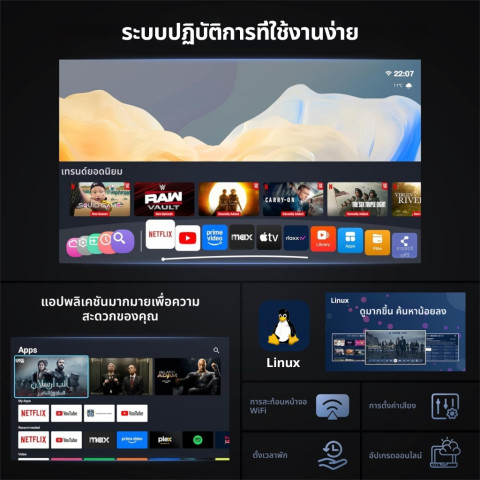 เชื่อมต่อครบ รองรับ Wi‑Fi สำหรับสตรีม/แคสต์, Bluetooth สำหรับต่อหูฟังหรือ ลำโพง, และ USB สำหรับเปิดไฟล์จากแฟลชไดรฟ์