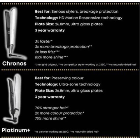 Chronos vs Platinum+: Chronos ปรับความร้อนตาม “การเคลื่อนไหวและมุมมือ” ได้ละเอียดกว่า จัดทรง เร็วกว่า ควบคุมได้ แม่นยำกว่า และให้ความเงางาม 85% (Chronos) vs 75% (Platinum+) พร้อมช่วยคุมชี้ฟูได้ดีกว่า