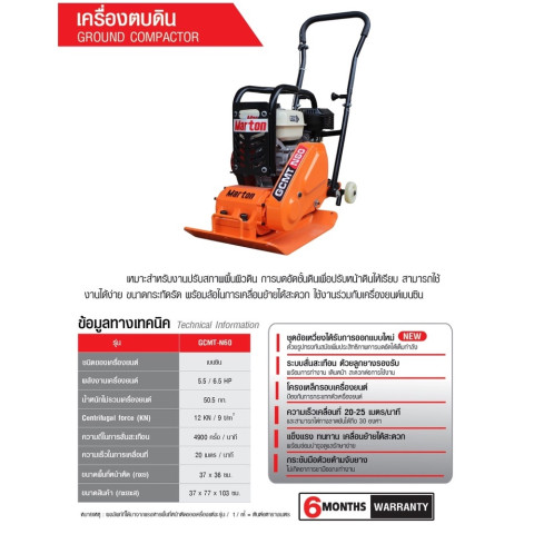เครื่องตบดิน MARTON รุ่น GCMT-N60 ขนาด 5-6 ตัน เครื่องตบดินพลังอัดแน่นเต็มกำลังด้วยชุดข้อเหวี่ยงแบบใหม่ ช่วยเพิ่มประสิทธิภาพแรงกระแทก เหมาะสำหรับงานบดอัดดิน งานปรับพื้น งานก่อสร้าง และงานซ่อมบำรุงพื้นที่ที่ต้องการความแน่นสม่ำเสมอ ใช้งานคล่องตัวด้วยระบบเดินอัตโนมัติ ขนย้ายสะดวก พร้อมรับประกัน 6 เดือน