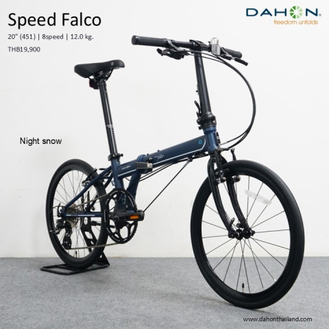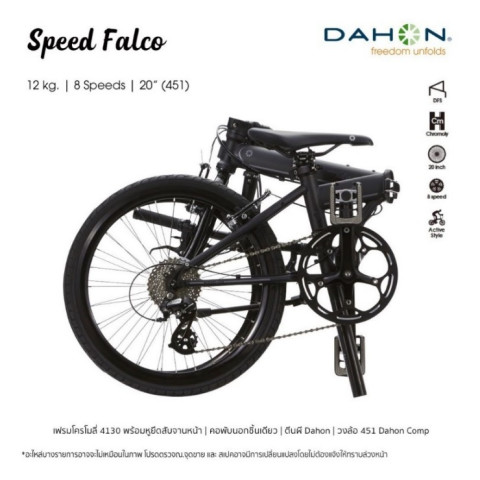 Dahon Speed Falco 2025 จักรยานพับสายซิ่งที่เกิดมาเพื่อคนชอบความเร็ว ด้วยล้อขนาด 20" (451) ที่ให้ความไหลลื่นและทำความเร็วได้ดีกว่าล้อ 406 อย่างชัดเจน พับเก็บง่าย พกพาสะดวก แต่ยังคงฟีลการปั่นแน่น ๆ แบบรถจริงจัง เหมาะทั้งปั่นในเมือง ไปทำงาน และจะอัปเกรดเป็นสายทัวร์ริ่ง “ทัวร์ซิ่ง” ก็ทำได้สบาย